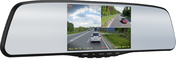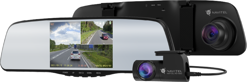 NAVITEL MR257 BLACK — зеркало заднего вида с видеорегистратором и дополнительной камерой для съемки происходящего позади автомобиля. Устройство выполнено в металлическом корпусе черного цвета и легко размещается прямо поверх заводского зеркала заднего вида с помощью надежных эластичных креплений, что делает его практически незаметным снаружи.